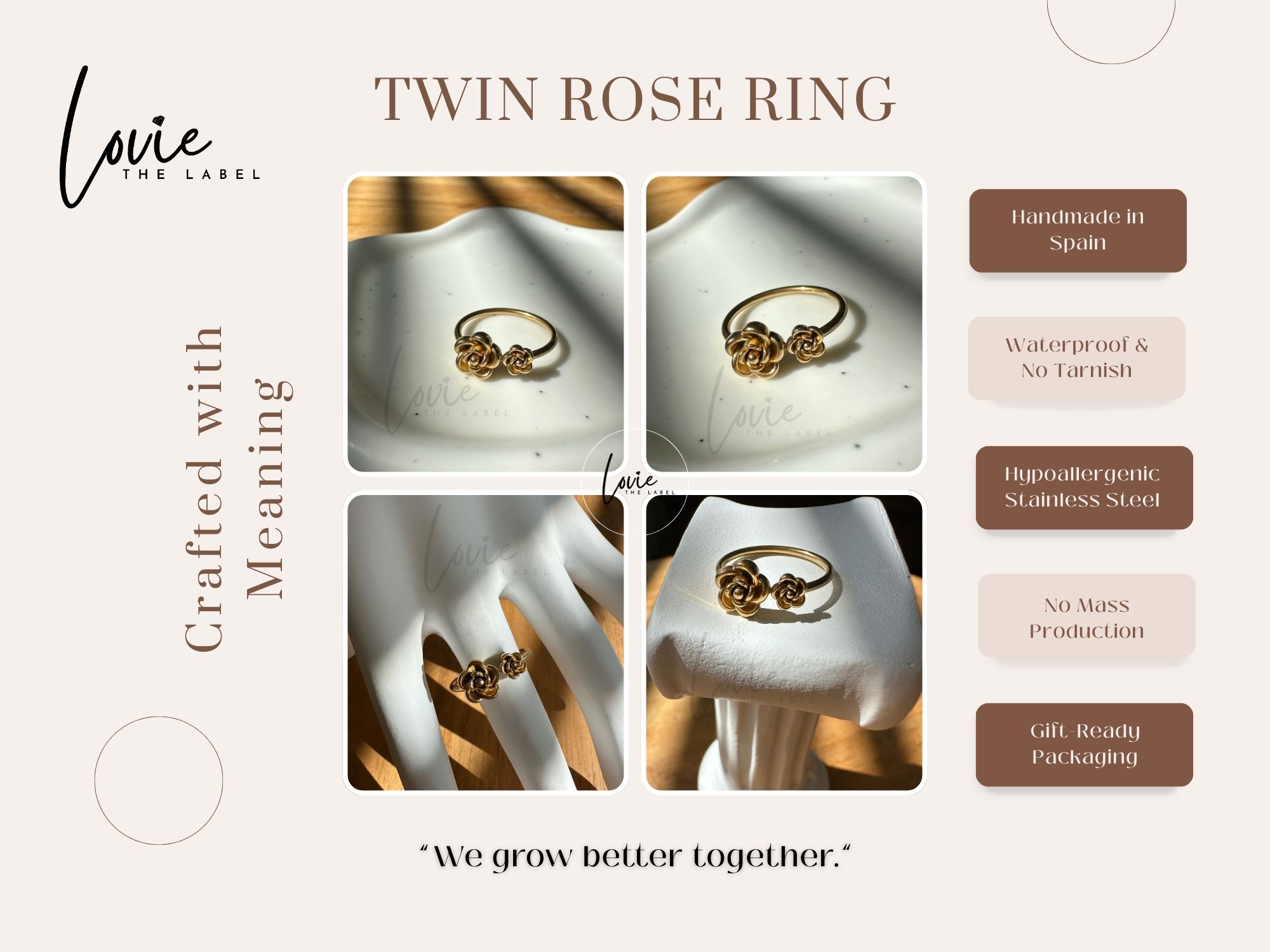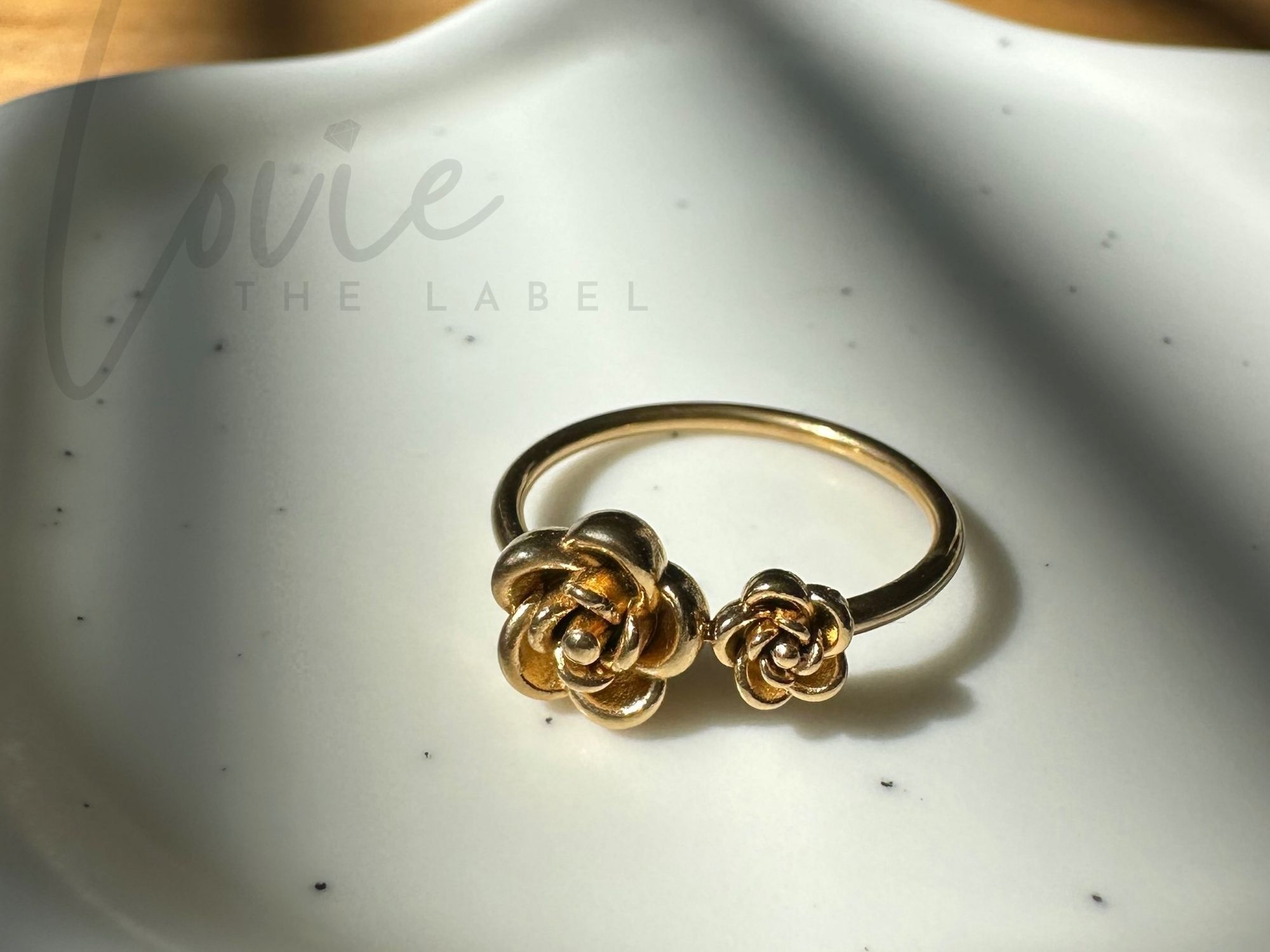 De Twin Rose Ring is een goudkleurige bloemring met twee elegante rozen, die samen symbool staan voor verbinding, liefde en groei. Deze ring is een subtiele eyecatcher die moeiteloos combineert met elke look, van casual tot classy.